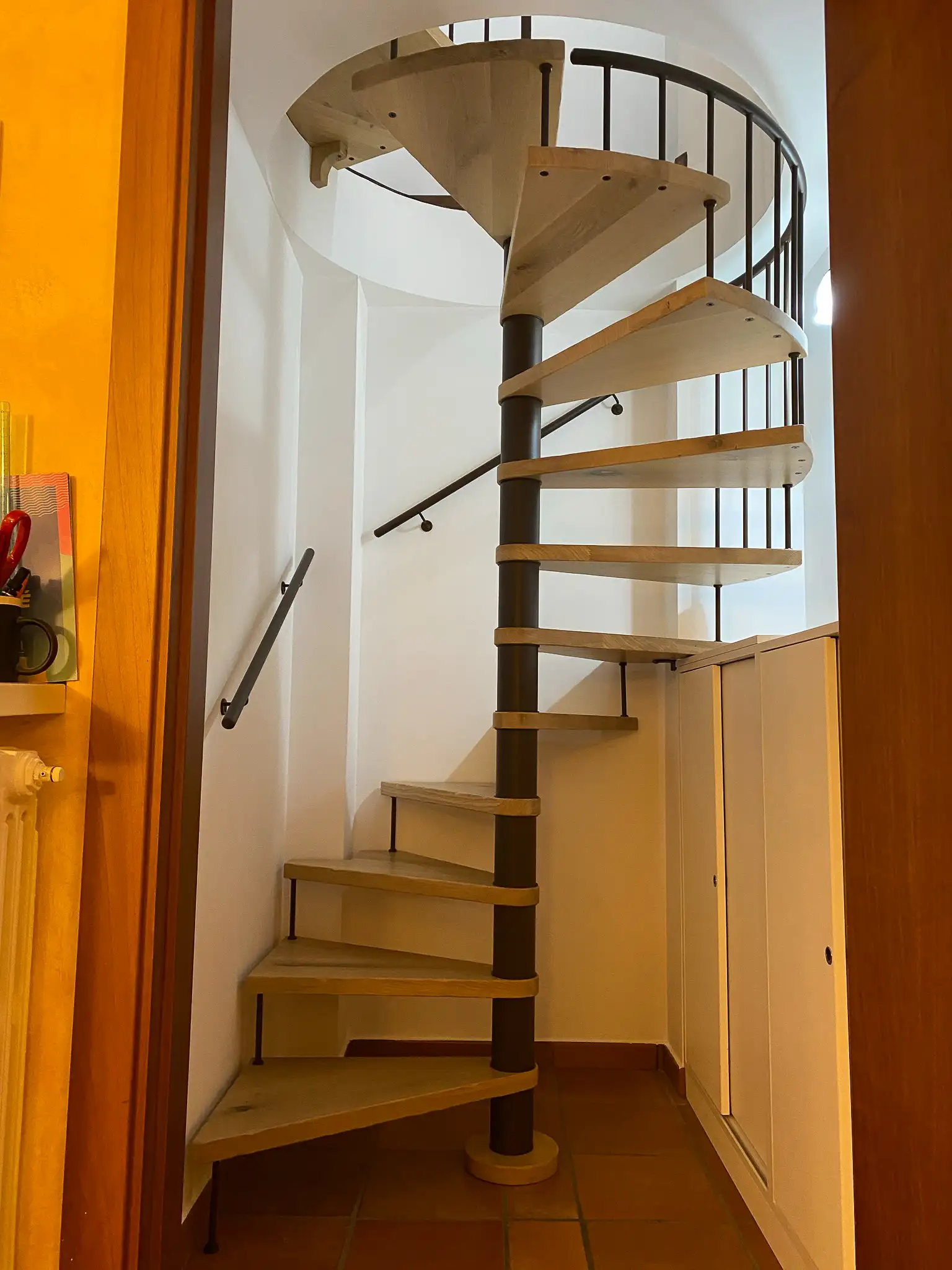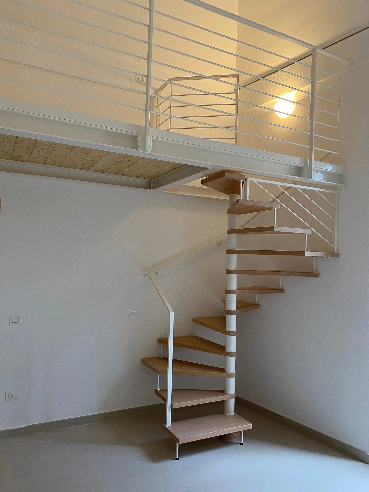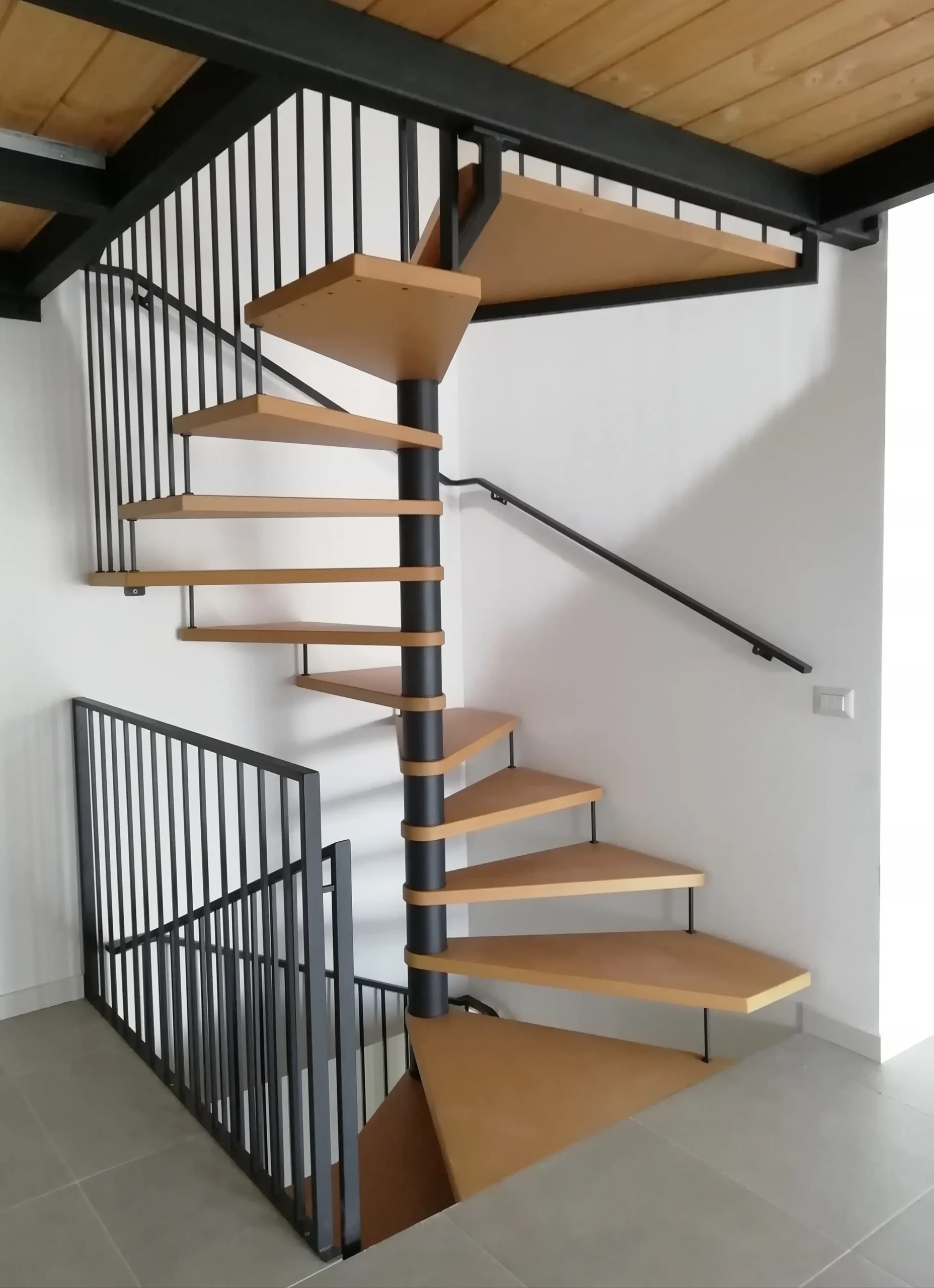 La scala a chiocciola mista a giorno è una soluzione che ci permette di risolvere problematiche legate agli accessi di entrata o uscita, essa infatti non si sviluppa solo nel senso circolare, ma sfrutta una parte di rampa lineare a seconda dell’esigenza. Con questa composizione inoltre miglioriamo la comodità d’uso e rendiamo più spazioso il sottoscala.